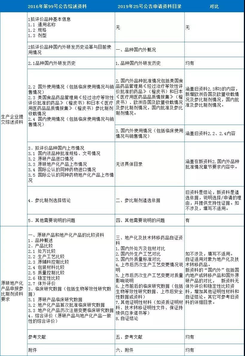 “2019年第25號”公告中的申請資料目錄更為精簡,適用對象包括生產(chǎn)企業(yè)、行業(yè)協(xié)會和自證企業(yè),主要區(qū)別在于國內(nèi)外品種批準(zhǔn)情況和自證資料。在新公告中,國內(nèi)外品種批準(zhǔn)情況包括國內(nèi)批準(zhǔn)情況(可同舊資料3)和國內(nèi)參比制劑情況(新增,包括國家已公布和其它企業(yè)申報公示和藥監(jiān)局發(fā)布情況等),以及美國、日本橙皮書和歐洲各國收載及參比制劑情況(主要針對原研和國際公認(rèn)同種藥物)。最新公告申請資料中的自證資料還含新增技術(shù)轉(zhuǎn)移藥品。